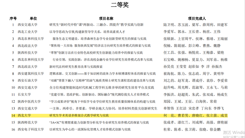 Recently, the Shaanxi Association for Academic Degrees and Graduate Education announced the results of the 2023 Shaanxi Graduate Education Achievement Awards. Our university has won 4 teaching achievements, among which the project “Research and Practice on Multidimensional Blended Teaching of Academic English for Graduate Students” submitted by our school won the second prize.