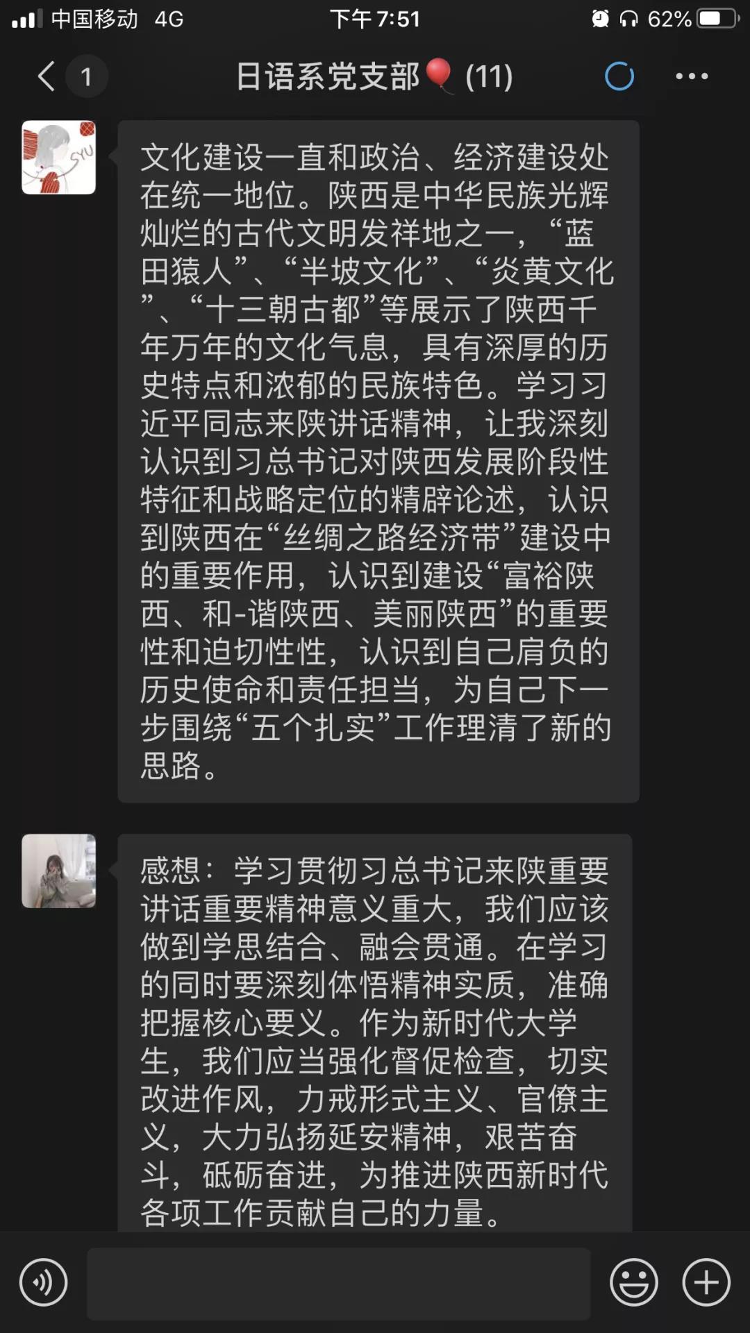 习近平总书记4月20日至4月23日来陕考察,就统筹推进新冠肺炎疫情防控和经济社会发展工作、打赢脱贫攻坚战进行调研,看望慰问陕西干部群众。强调做好“六稳”工作,落实“六保”任务。强调做好“秦岭生态保护”、强调弘扬“西迁精神”、强调扎实“脱贫攻坚”等。为深入推进学习习近平总书记来陕考察重要讲话效果,学院各党支部以此为主题开展党日活动,进行了集中学习分享。