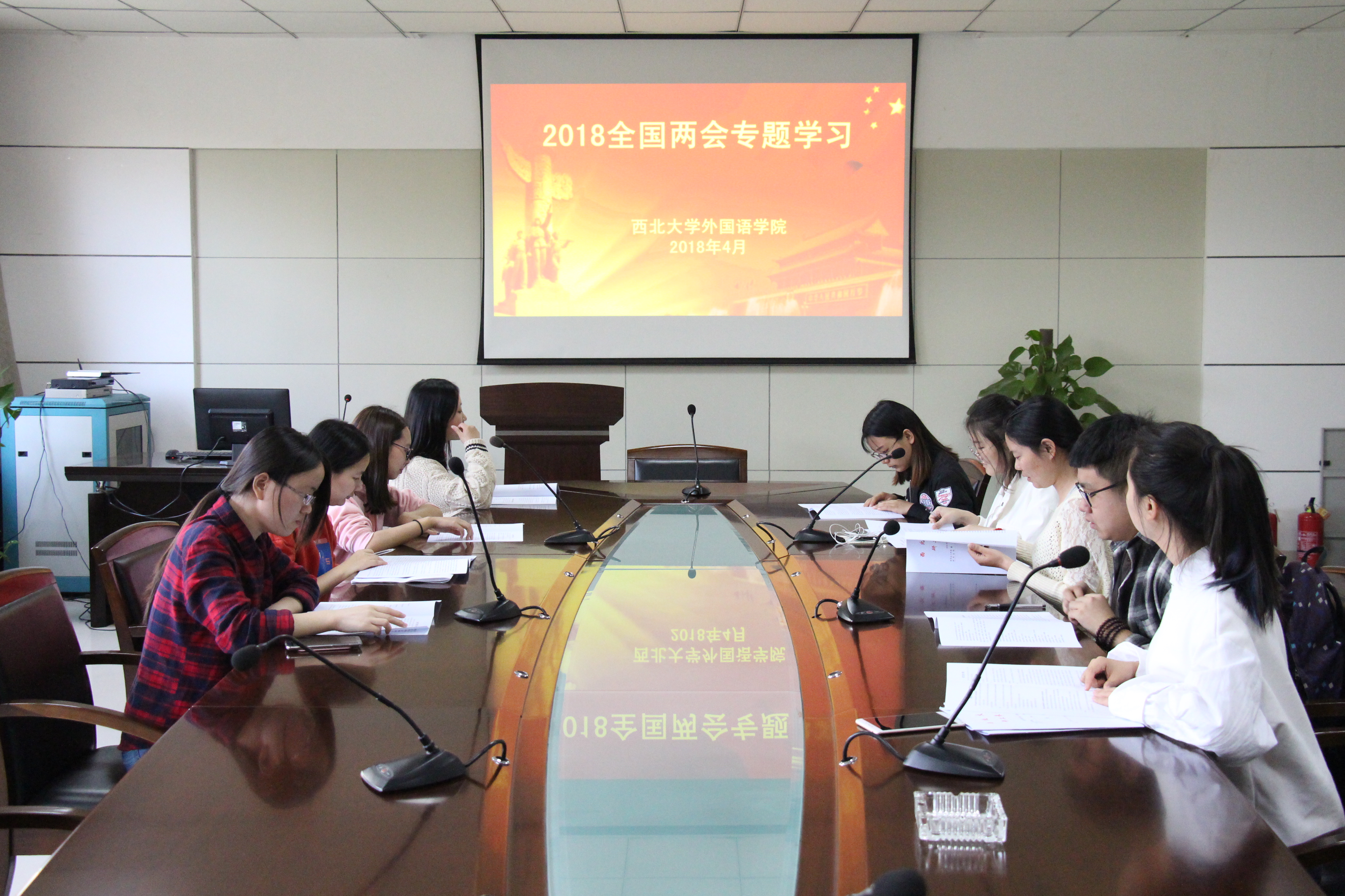2018年4月9日,我院研究生党支部书记、党务工作站学生负责人集体学习两会精神。会上,集中学习了两会的具体内涵与深刻意义,两会热点解读,从收入、教育、就业等多角度了解了本次两会上出现的新政策。之后,同学们进行了交流,表示作为新时代的青年,要不断提升自我,将个人理想与时代紧密结合,勇担历史责任。