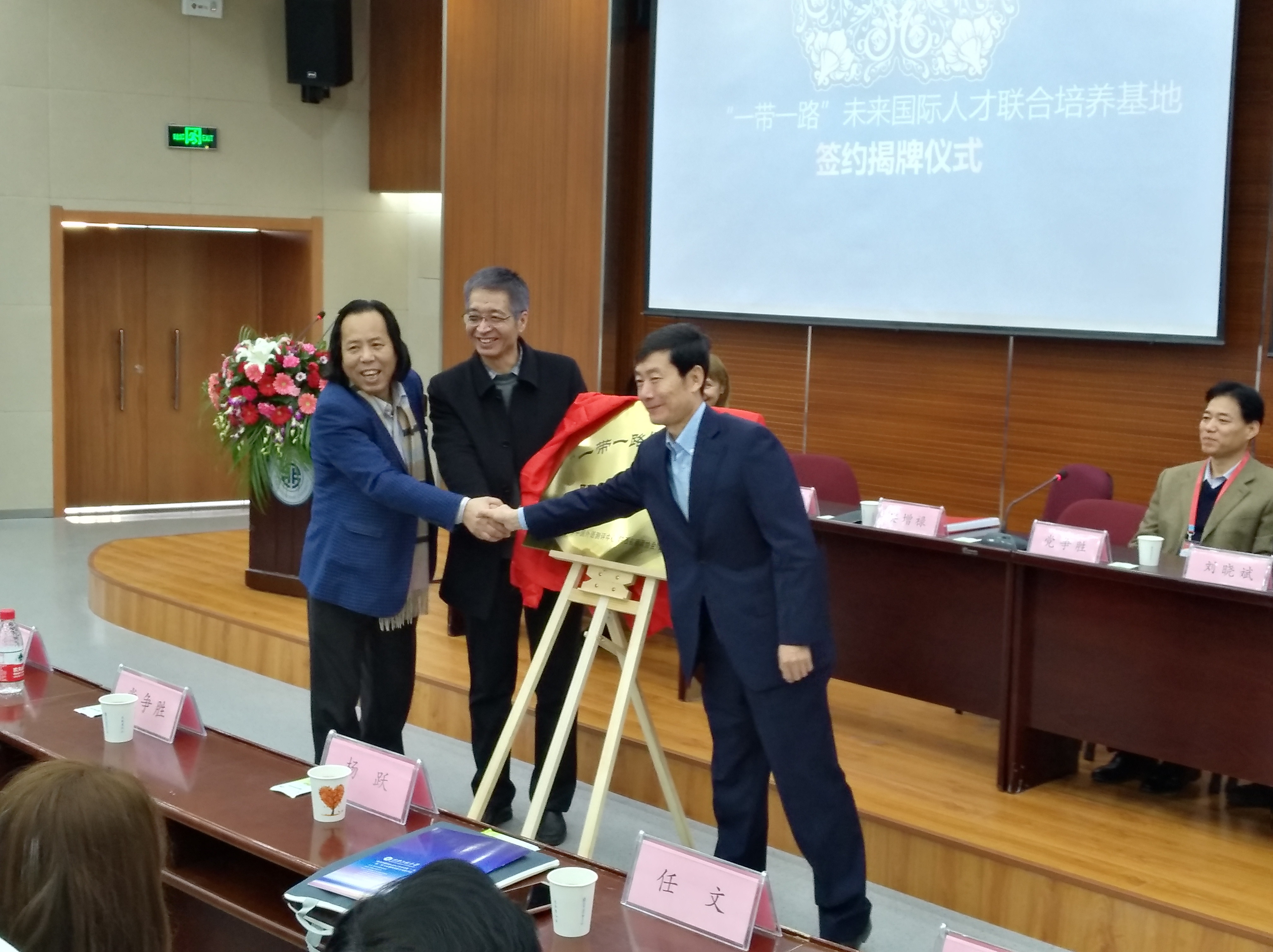 胡宗锋教授和西安工程大学樊增禄副校长、外语教学与研究出版社总编辑徐建中一起为“一带一路未来国际化人才培养基地”揭牌