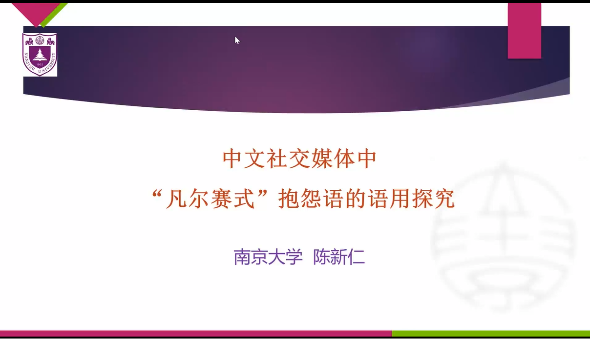 11月18日,南京大学外国语学院教授、博士生导师陈新仁教授以腾讯会议在线直播的方式为我院师生带来了“社交媒体中‘凡尔赛式’抱怨语的语用探究”主题讲座。本次会议由我院胡宗锋教授主持,我院部分教师、2021级学术研究生、2022级学术及专业研究生等百余名师生在线参与了本次讲座。