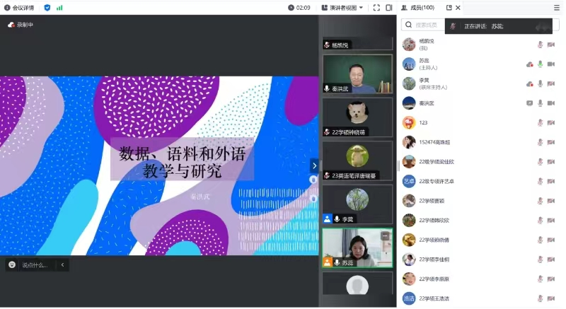 线上,秦洪武教授与师生就数据、信息、语料、外语教学与研究相关问题展开了研讨与交流。本次讲座增强了师生对数据、信息和外语研究的兴趣,拓宽了师生对外语教学与研究的思路。