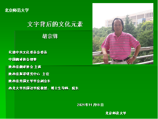 2021年11月19日下午, 我院胡宗锋教授为北京师范大学外国语言文学学院的学生做 “文字背后的文化元素”线上讲座,胡宗锋教授结合自己多年来的翻译实践,为学生们讲述了文学翻译,特别是陕西作家作品翻译中,文字与其文化背景的理解与翻译问题。