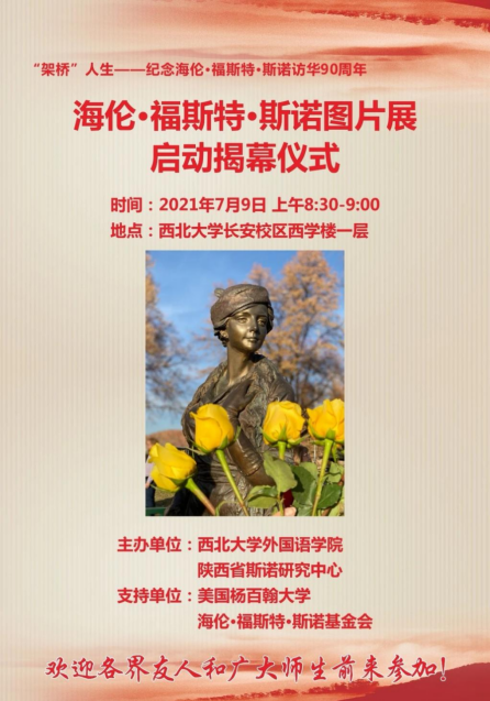 7月9日,为纪念海伦·福斯特·斯诺访华90周年,了解她的“架桥”人生,回顾海伦对中美友谊和民间外交做出的特殊贡献,海伦·福斯特·斯诺图片展开幕仪式在必赢亚州242举行。本次展览由必赢亚州242和陕西省斯诺研究中心联合主办,图片由美国杨百翰大学提供,其中部分照片为全球首次展出。开幕仪式邀请到了陕西省斯诺研究中心创始人、著名斯诺研究专家安危先生,陕西省斯诺研究中心高级顾问惠树成、马珂以及各专家学者。