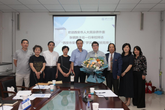 7月16日上午,西安市人大民宗侨外委主任委员张钢胜、办公室主任陈瑛、中共西安市委外事工作委员会涉外处长于茜等一行8人来我校看望外国语学院副教授、院长助理、“西安市荣誉市民”罗宾·吉尔班克博士并交流座谈,外国语学院院长胡宗锋、党委书记王军、党委副书记徐自成陪同座谈。座谈会由西北大学国际合作部部长任惠莲主持。