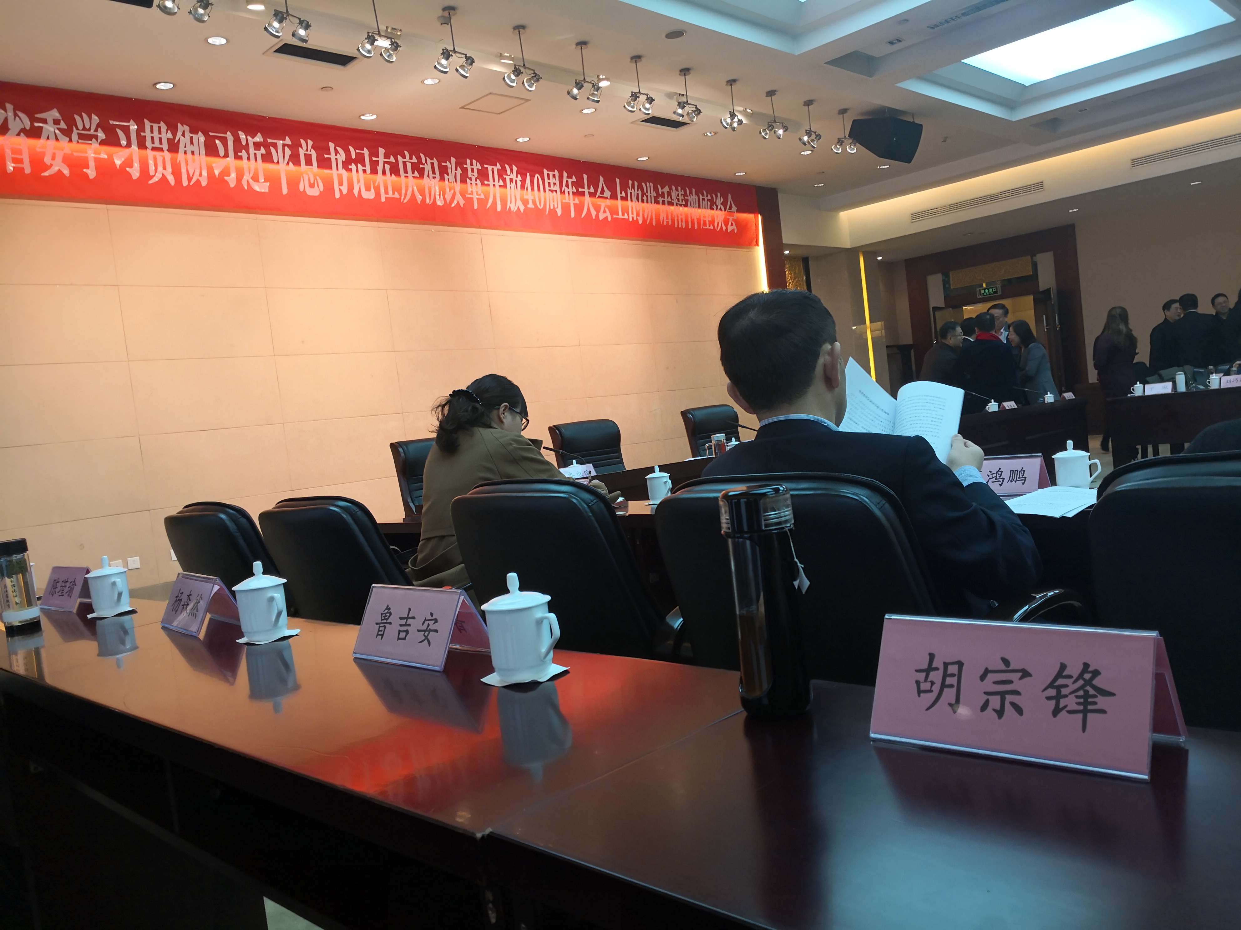 1月4日,省民建召开学习贯彻习近平总书记在庆祝改革开放40周年大会上的重要讲话精神座谈会。省政协副主席、省民建主委李冬玉出席会议并讲话。省委会委员、各专门委员会主任副主任、市级组织专职副主委、省委会监督委员会委员和机关处级以上干部参加座谈会。作为省民建理论与文化委员会副主任,我院胡宗锋教授应邀出席了本次座谈会。